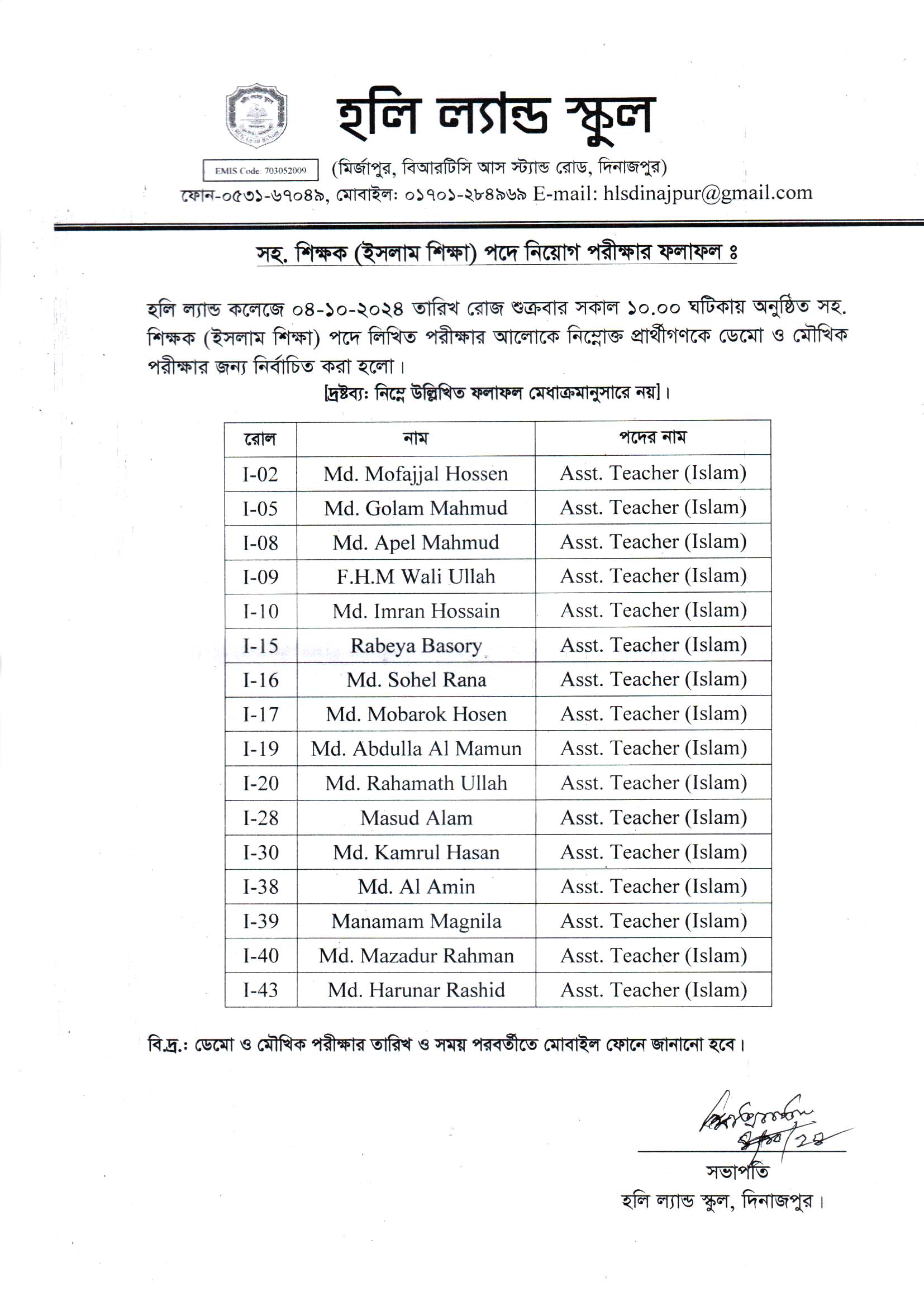 গত ০৪-১০-২০২৪ তারিখ (শুক্রবার) সহ. শিক্ষক (ইসলাম শিক্ষা) পদে লিখিত পরীক্ষার ফলাফল।