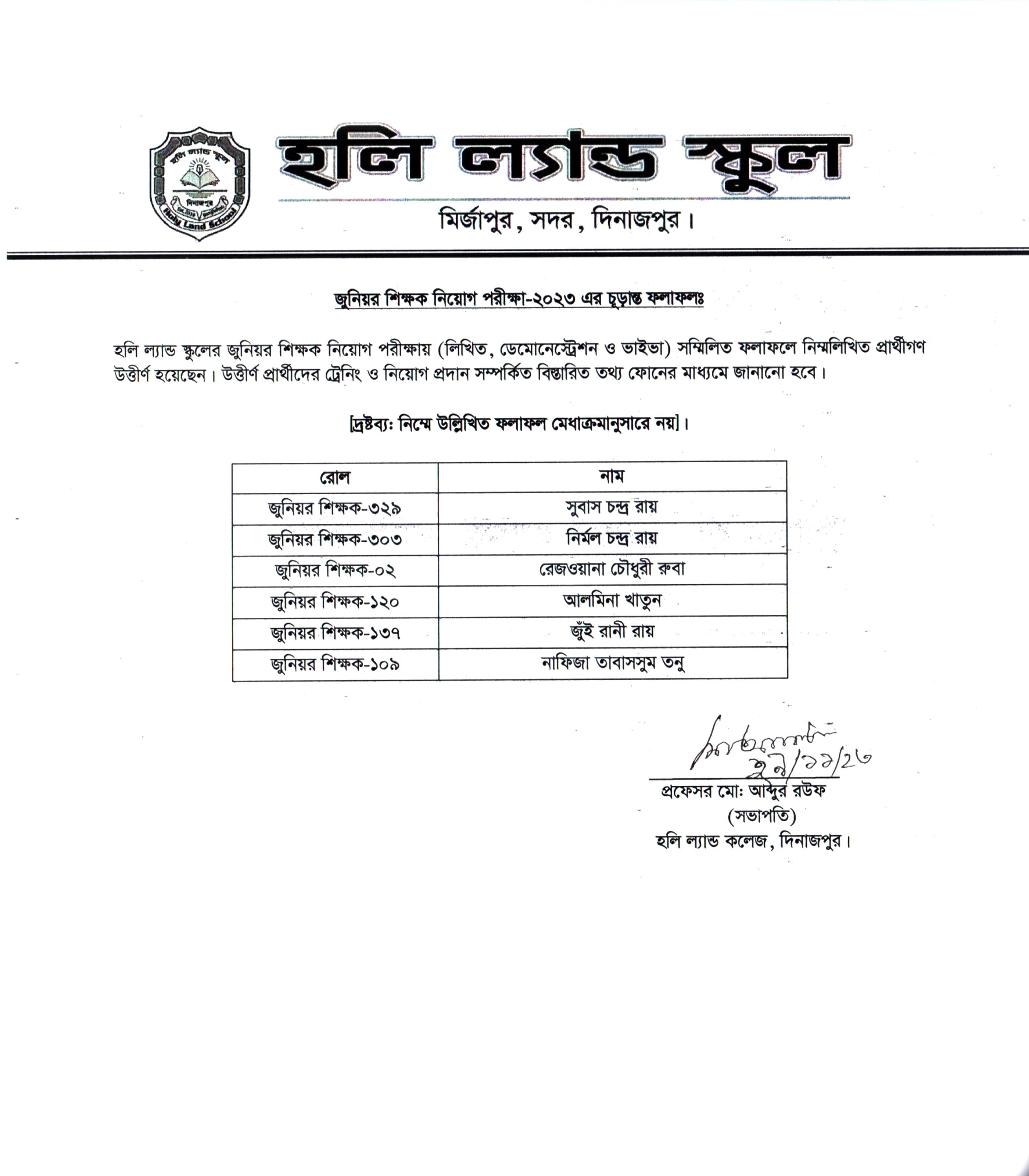 জুনিয়র শিক্ষক নিয়োগ পরীক্ষা-২০২৩ এর চূড়ান্ত ফলাফল