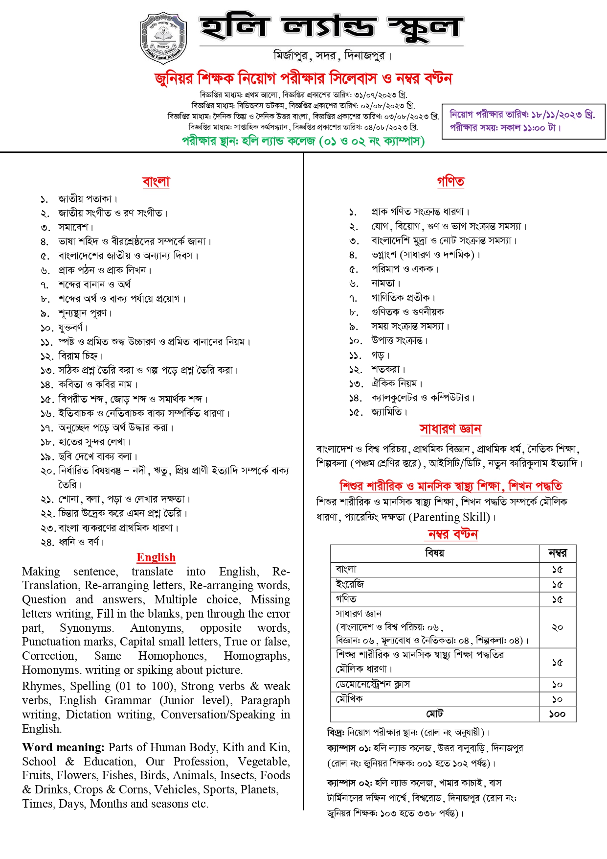 জুনিয়র শিক্ষক পদে ১৮-১১-২৩ তারিখের নিয়োগ পরীক্ষার সিলেবাস ও নম্বরবণ্টন।